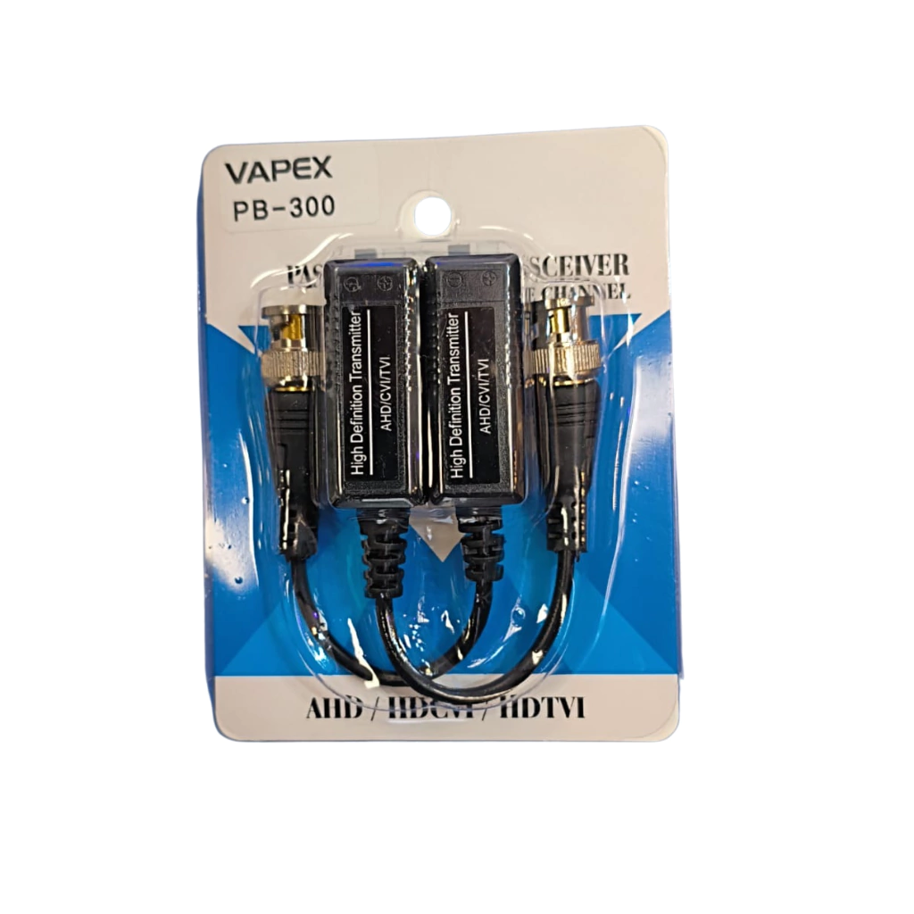 El Balun Pasivo PB‑300 Vapex es utilizado principalmente en sistemas de video CCTV, convirtiendo señales de 75 Ω (BNC coaxial) a pares balanceados diseñados para transmisión por cable tipo UTP de 300 Ω con baja pérdida