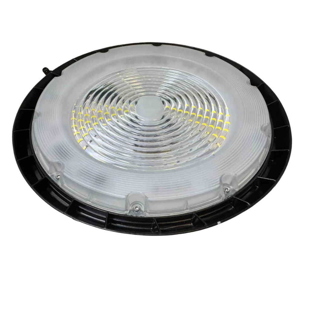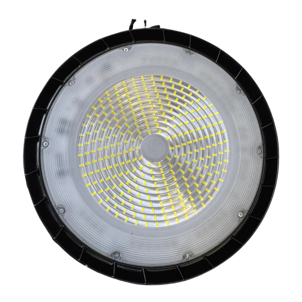 Luminaria LED UFO Galponera Aluminio Negro 200W con Gancho Interelec, diseñada especialmente para espacios industriales, galpones y exteriores que requieren una iluminación potente y eficiente.